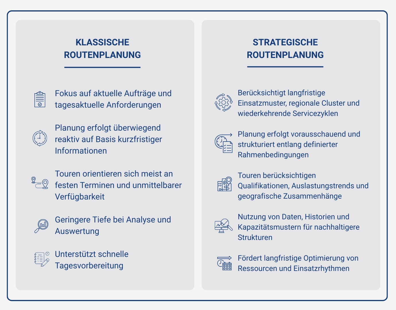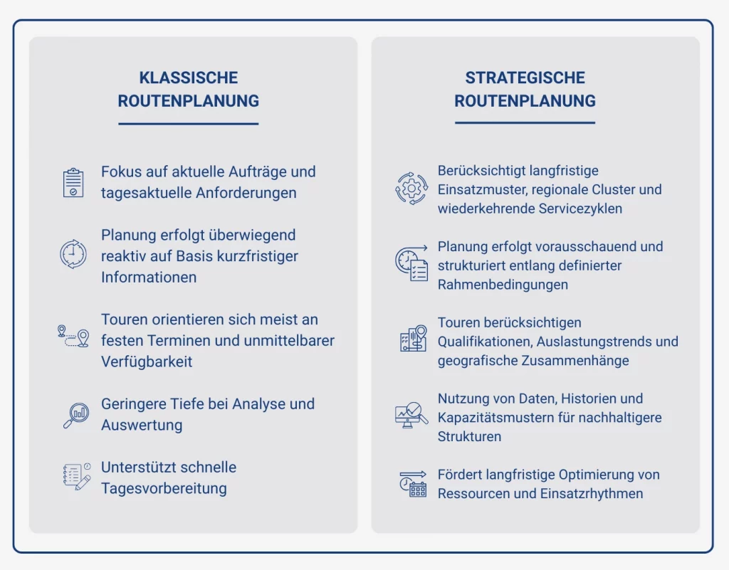 Unterschiedliche Planungsansätze wirken sich deutlich auf Effizienz, Stabilität und Arbeitsrhythmus im Außendienst aus. Während klassische Methoden vor allem den unmittelbaren Tagesablauf abbilden, richtet sich strategische Planung stärker an wiederkehrenden Mustern und künftigen Anforderungen aus. Dieser Vergleich zeigt, wie beide Ansätze arbeiten und welche Wirkung sie im Serviceumfeld entfalten: