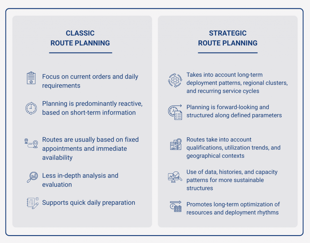 Different planning approaches have a significant impact on efficiency, stability, and work rhythms in the field. While classic methods primarily reflect the immediate daily routine, strategic planning is more focused on recurring patterns and future requirements. This comparison shows how both approaches work and what effect they have in the service environment: