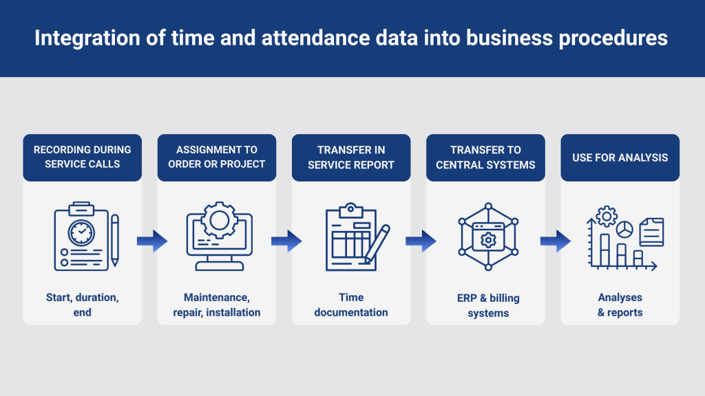 In day-to-day business operations, work time data provides a crucial foundation for various operational processes. Work time management ensures that recorded times are captured in a structured manner and transferred to downstream processes. Particularly in technical service, time data can be assigned to individual jobs or projects and subsequently transferred to other enterprise systems.