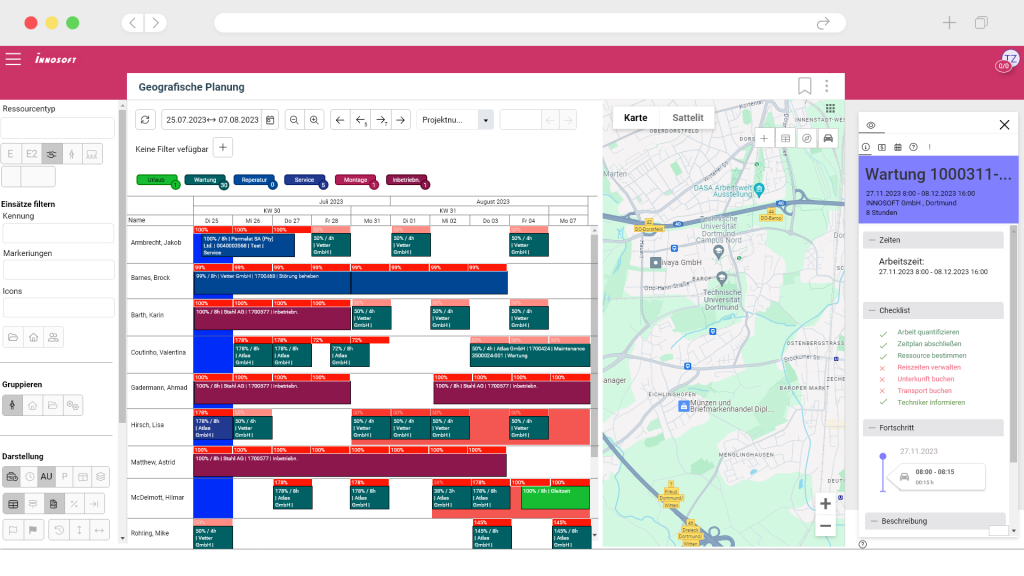 Aktuelle Zeitdaten zeigen verfügbare Kapazitäten im Service. Innosoft unterstützt Disposition und Serviceleitung dabei, Techniker realistisch einzuplanen und Einsätze übersichtlich zu koordinieren.