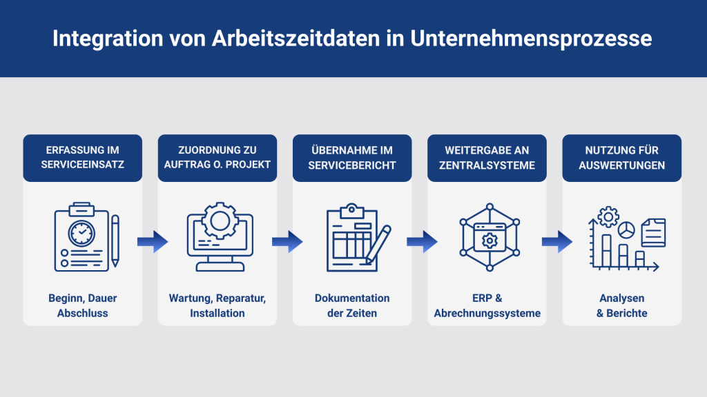 Im Unternehmensalltag liefern Arbeitszeitdaten eine wichtige Grundlage für verschiedene betriebliche Abläufe. Arbeitszeitmanagement sorgt dafür, dass dokumentierte Zeiten strukturiert erfasst und in nachgelagerte Prozesse überführt werden. Besonders im technischen Service lassen sich Zeitdaten einzelnen Aufträgen oder Projekten zuordnen und anschließend in weitere Unternehmenssysteme übergeben.